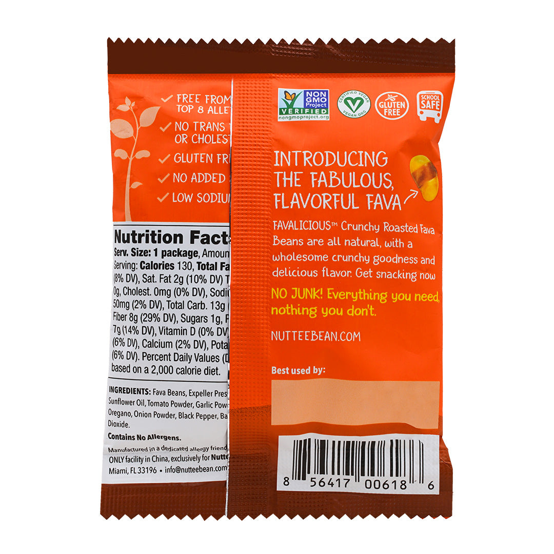 Ingredients: Fava Beans, Expeller Pressed Sunflower Oil, Tomato Powder, Garlic Powder, Oregano, Onion Powder, Black Pepper, Basil, Silicon Dioxide